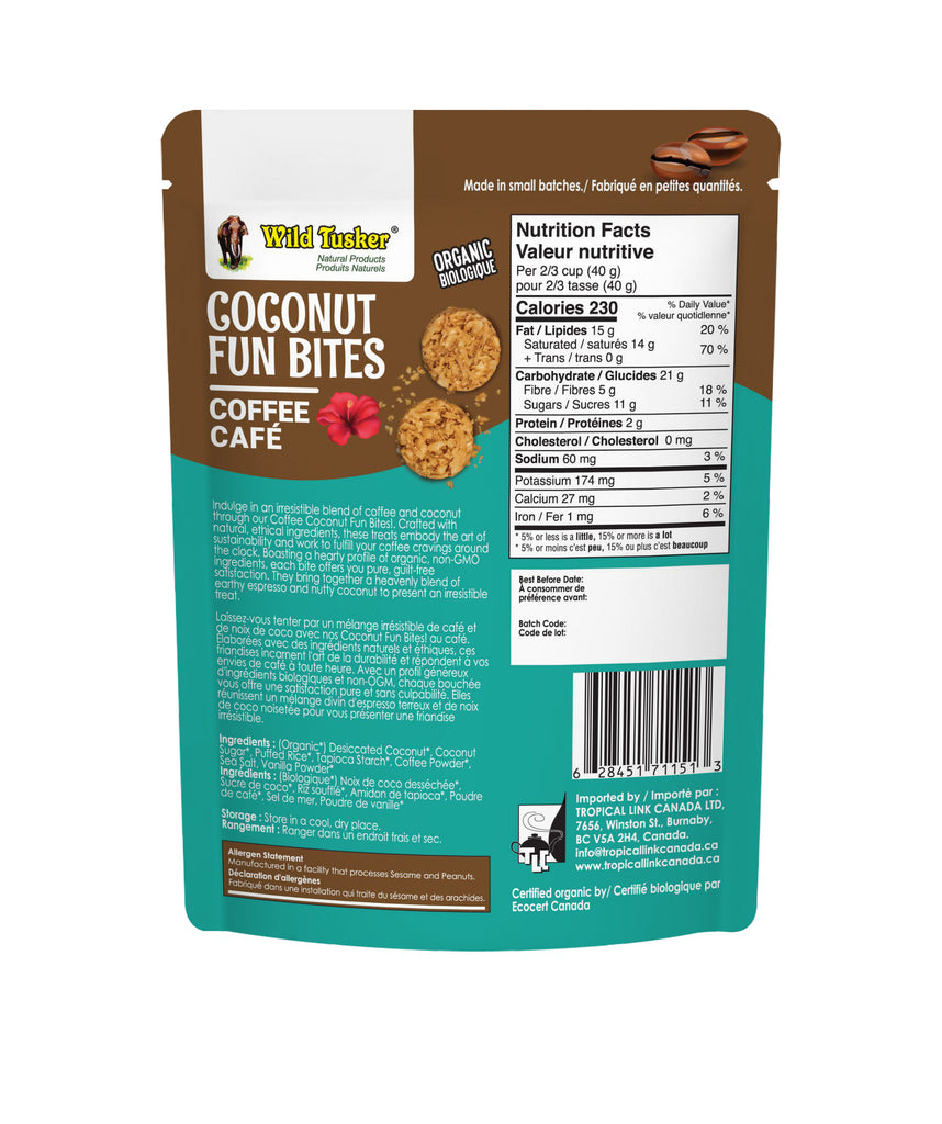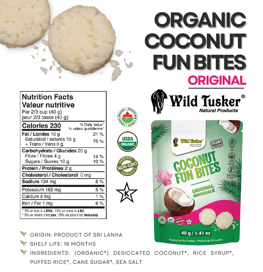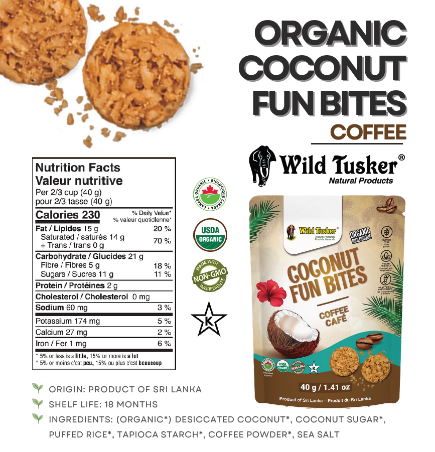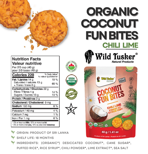 Snack boldly with Wild Tusker Organic Coconut Fun Bites — a naturally sweet and satisfying treat made from real coconut. These crunchy little bites are crafted with organic ingredients, lightly baked, and available in four irresistible flavours. Whether you're craving something tropical, spicy, or just purely coconut, there's a bite-sized burst of goodness waiting for you.